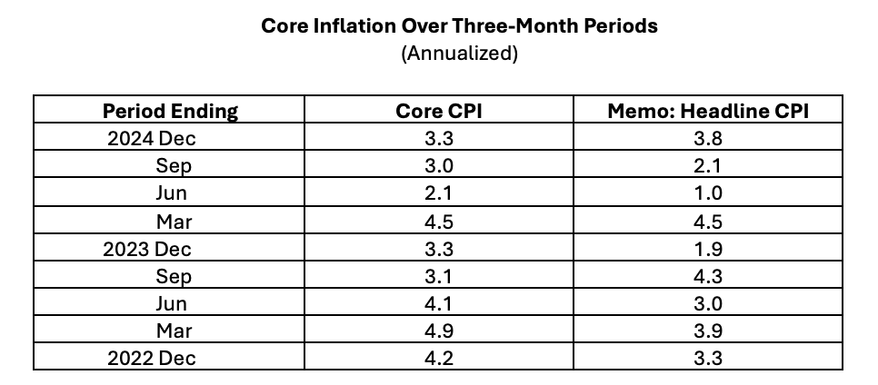 Can we conclude that core inflation continued to fall over 2024? The table below, showing three-month changes in core CPI inflation (annualized), addresses this question. Over the periods ending in March, June, and September 2024, there was lower core CPI inflation than in the counterpart periods in 2023. However, core CPI inflation for the three months ending in December 2024 was unchanged from a year earlier, at 3.3 percent, suggesting that the disinflation process may have stalled.