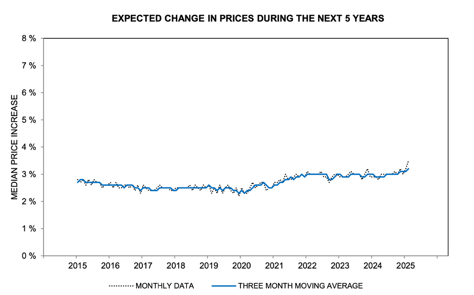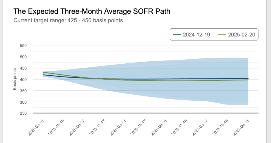 Broadly consistent with no change in the yield on the two-year note are expectations for the path of the secured overnight financing rate (SOFR) over the next few years—which tracks closely expectations for the Fed’s policy interest rate—and is little changed since the FOMC meeting in December. The green line shows the expected path on a recent date and is almost indistinguishable from the blue line, the expected path right after the Fed’s announcement in on December 18. (At both times, market participants envisioned a small rate cut by the end of 2025.)