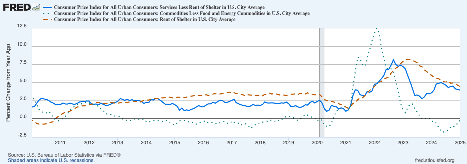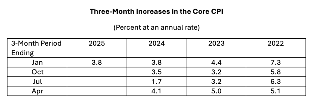 For the three-month period ending in January, there was a slowing in 2023 and 2024 but no slowing in 2025. The inflation rate for the three-month period ending in January 2025 was the same as in the comparable period ending in 2024, 3.8 percent (and well above the twelve-month rate). Thus, it’s hard to find evidence of further disinflation in the core and headline CPI data.