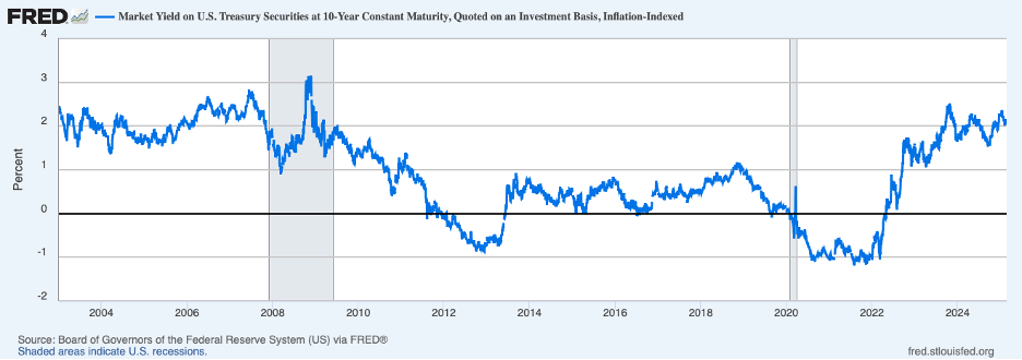 The above discussion may suggest that there is not sufficient monetary restraint coming from the Fed to bring inflation lower. The chart below shows that the real federal funds rate (the federal funds rate adjusted for underlying inflation) was a little above 1-1/2 percent at year-end 2024, down from 2-1/2 percent before the mid-September 2024 rate cut. Of importance is the relationship between the real federal funds rate and the neutral rate (the level of the real federal funds rate at which monetary policy is neither stimulative nor restrictive). The neutral rate is not observable directly and must be estimated. Many estimates suggest that the neutral rate had been on the order of 2-1/2 percent for some time prior to the financial crisis in 2008. The neutral rate is estimated to have subsequently fallen precipitously to around 1 percent before retracing some of that post-2008 decline.