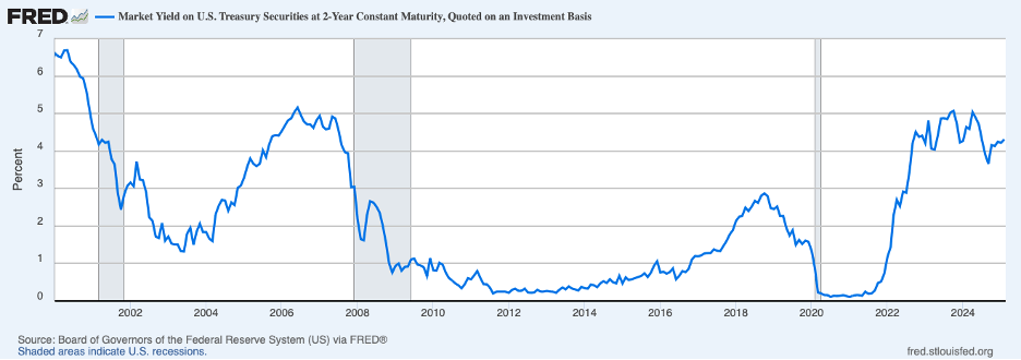 The Fed announced in late January that it was standing pat on its target for the federal funds rate, following three consecutive rate cuts amounting to 100 basis points. The chart below shows the yield on the two-year Treasury note which can be thought of as expectations of market participants of the average federal funds rate over the next two years. This rate, near 4.3 percent, is down 50 basis points since midyear 2024. However, despite somewhat disappointing inflation news, it has remained unchanged since the last rate cut in December.
