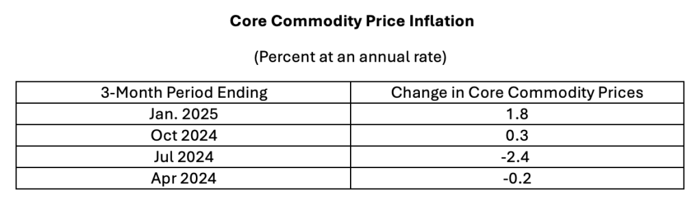 After wild swings in recent years owing to supply-chain disruptions, the twelve-month change in core commodity prices was essentially zero in January, comparable to the pre-pandemic period. However, the twelve-month change appears to be masking an upward trend in core commodity price inflation. The next table shows (annualized) core commodity inflation over recent three-month periods. Core commodity prices rose at an annual 1.8 percent over the three months ending in January after being essentially flat over the previous three-month period. This evidence could suggest that core commodity prices may be settling into increases that will exceed the pre-COVID period.