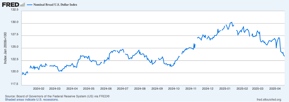 Typically, turmoil in the stock market is accompanied by a flight to safety by investors who seek the safety and liquidity of U.S. Treasury securities. And a shift into Treasury securities typically is accompanied by a stronger dollar on the foreign exchange market. However, since the tariff announcement on April 2, the dollar has fallen nearly 3 percent, shown in the chart below, with some of that drop coming once criticism of the Fed intensified.
