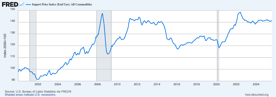 There is scant evidence that foreign suppliers have borne much of the tariffs as import prices before tariffs, shown next, have been little changed over the past year.