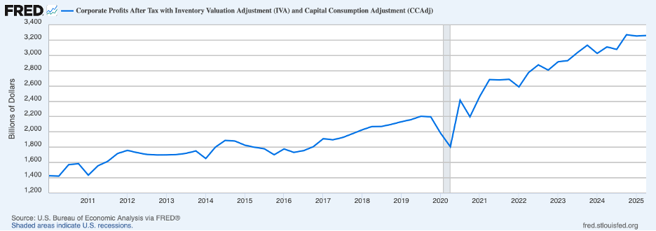 The implication is that much of the burden of the tariffs has been absorbed by U.S. businesses. Indeed, the general upward trend in corporate profits, shown in the next chart, seems to have been interrupted in the first half of this year. Surveys of domestic businesses indicate that those businesses affected most by tariffs plan to pass more of their tariff costs onto consumers in the months ahead.