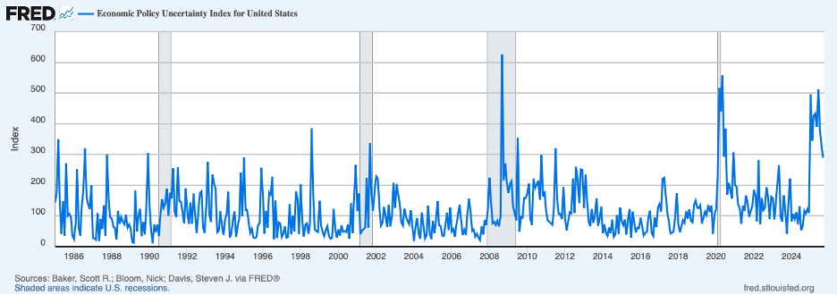 Crosscurrents are affecting the U.S. economy. Uncertainty about U.S. economic policy (shown in the chart below) remains exceptionally high. This uncertainty reflects the vicissitudes of tariff policy and worries about Fed independence. inducing some caution on the part of business and consumer spenders. Conversely, prospective returns on business investment are getting a boost from broad-based deregulation and from investments in AI and supporting infrastructure.