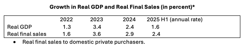 Growth in output and employment have slowed in 2025, partly owing to the dramatic turnaround in immigration. In addition, tariffs, a form of tax, are holding down output and employment and pushing up prices, especially prices of commodities. Nonetheless, there appears to be momentum in growth of output and aggregate demand. The table below shows growth in real GDP through the first half of this year. Real output is measured to have slowed to 1.6 percent at an annual rate over the first half of 2025 and is on track for 3+ percent growth in the third quarter. Unusual patterns of growth over the first half of this year, at a time when imports surged in the first quarter and GDP is estimated to have contracted, raise questions about whether the estimates may have been distorted. A better indicator of underlying demand in these circumstances is real final sales to domestic private purchasers (real personal consumption expenditures plus real investment) shown on the bottom line of the table. Real final sales also slowed in the first half of the year, but to a lesser extent than GDP. (The other components of aggregate demand—net exports and government outlays—had essentially a neutral effect on growth in aggregate demand over the first half.) Moreover, growth in final sales exceeded growth in potential GDP which is estimated to be around 2 percent. Thus, there is some ongoing momentum in aggregate demand propelling the economy forward, despite the heavy headwinds.