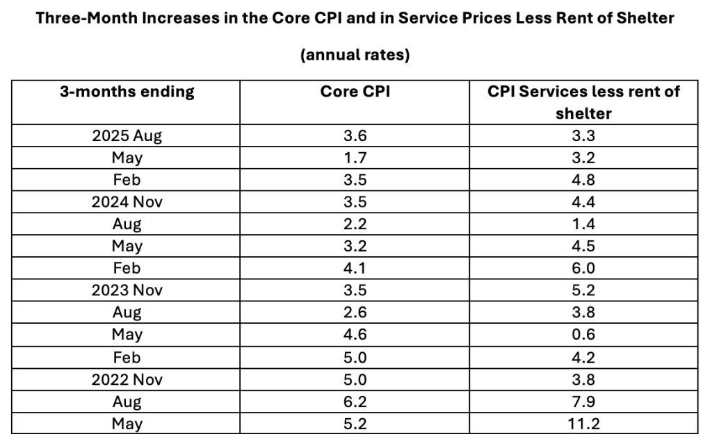 Looking at shorter periods, the second column in the table below (presenting annualized three-month increases for periods ending in the months shown) does not point to a slowing of core inflation in recent months. Indeed, the table shows that core inflation rose a good bit faster in the three months ending this August than over the same period a year earlier.