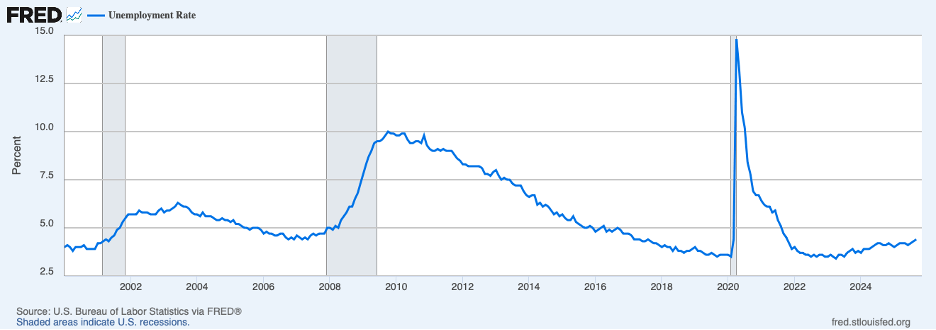 With the 25-basis point cut in the target for the federal funds rate on December 10, the Fed has lowered this target rate a cumulative 175 basis points in fifteen months. Over this time, inflation has remained stubbornly above the Fed’s 2 percent objective while the unemployment rate moved up from 4.2 percent in August 2024 to 4.6 percent in November 2025. In the December 10 FOMC statement, the Fed emphasized, “….that downside risks to employment rose in recent months.”