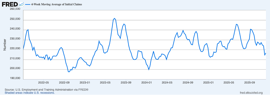 More recent data on the labor market suggest that labor market conditions have been fairly stable (November household and establishment employment data were based on the week that includes November 12). Initial claims for unemployment insurance remained low through early December (the next chart), suggesting that layoffs have not picked up. (The chart shows the four-week average which smooths through volatility around holidays, such as Thanksgiving.) Summing up data on the labor market, employers have been adjusting employment by cutting back on both job openings and hiring but are retaining existing workers and not stepping up layoffs (in November, average weekly hours worked ticked up implying that employers were utilizing current workers to meet demand). Although the labor market is somewhat softer overall than in recent years, it does not appear to have deteriorated much recently.