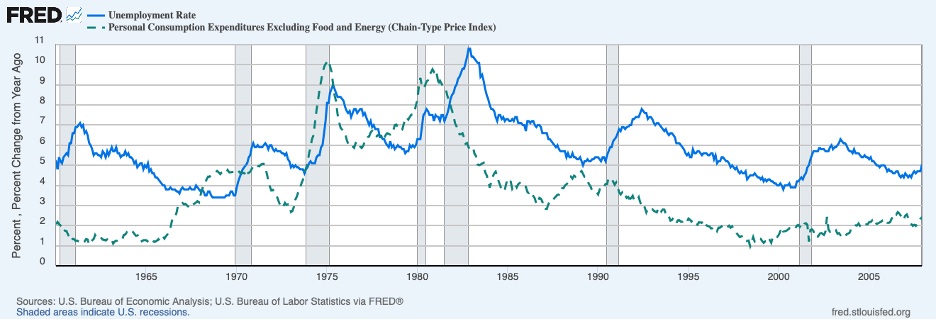 During this time, Fed policymakers were vigilant in their determination to avoid an upturn in inflation. Early in this period, they recognized that inflation was still above the level they were seeking (though the Fed did not specify a numerical target for inflation until 2012). Fed policymakers decided that they would pursue a strategy of “opportunistic disinflation” under which they would resist upward pressure on inflation using policy restraint but allow negative shocks causing recession to show through in lower inflation (a so-called asymmetric reaction function). This strategy worked very well, largely because policymakers understood that sustained maximum employment required stable prices. A critical lesson to be learned from this episode is that inflation, once it is underway, develops a persistence that becomes difficult to reverse and that leads to vexing policy choices.