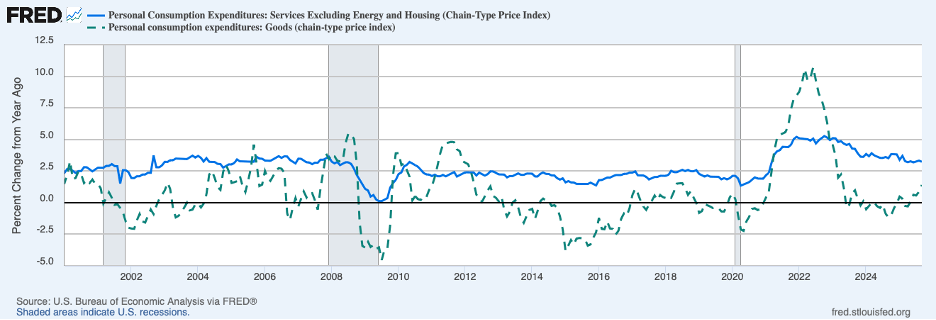 Recent readings on headline and core inflation have been affected by tariffs which are boosting prices of goods, especially those with import content. The chart below shows that PCE goods prices (the broken green line) have been on an upward swing. Goods prices rose 1.4 percent over the twelve months ending in September, a turnaround from the 1.2 percent drop over the twelve months ending a year earlier. Tariffs have played a big role in the reversal.