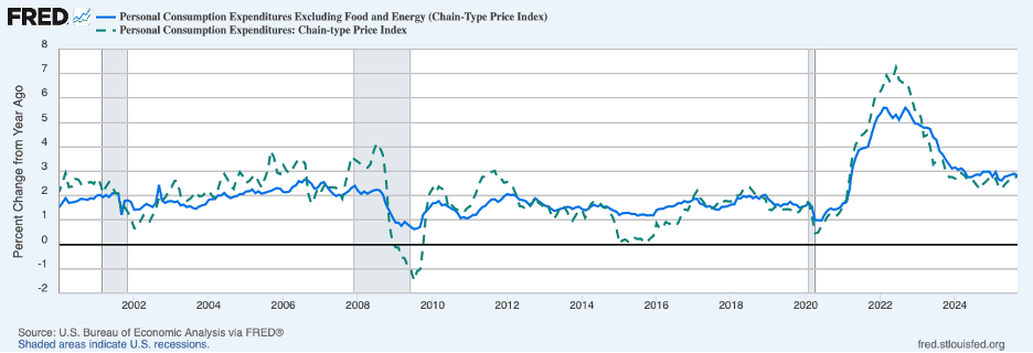 Sometimes, the Fed’s goals of maximum employment and stable prices (the dual mandate) do not conflict. However, often they do conflict—the present time being a prime example. Core inflation, based on the Fed’s preferred PCE index, was 2.8 percent over the twelve months ending in September (most recent data), shown by the blue line below. This is the same percent increase as a year earlier.