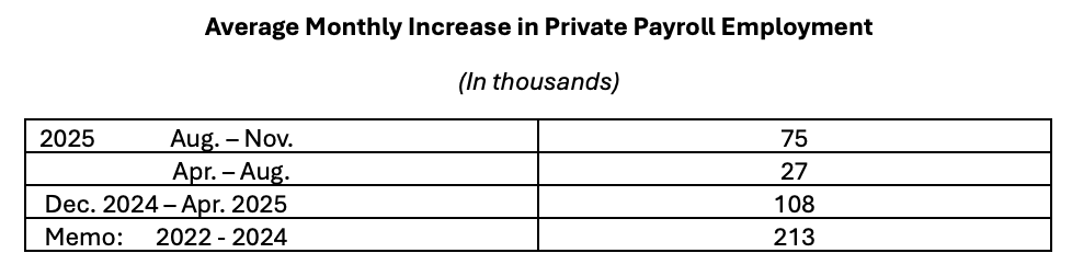 Turning to the survey of employers (Establishment Survey), the table below shows that private employment picked up over the three months ending in November to 75 thousand per month from only 27 thousand over the April to August period. Both are down considerably from the previous three years, but much of the slowdown owes to the sharp decline in immigrants entering the labor market. (Concurrently, there has been a slowing in demand for workers.)